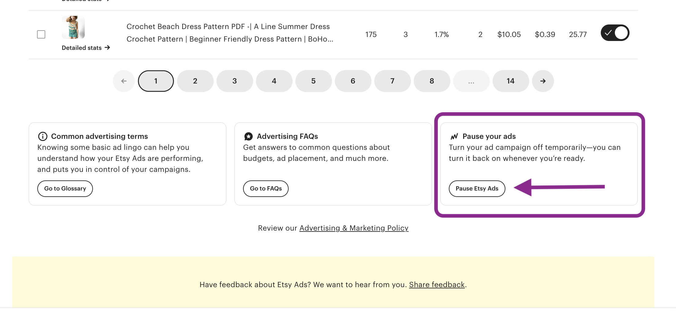 LOCATE IF ETSY ADS IS ON AND MANAGE ETSY ADS: