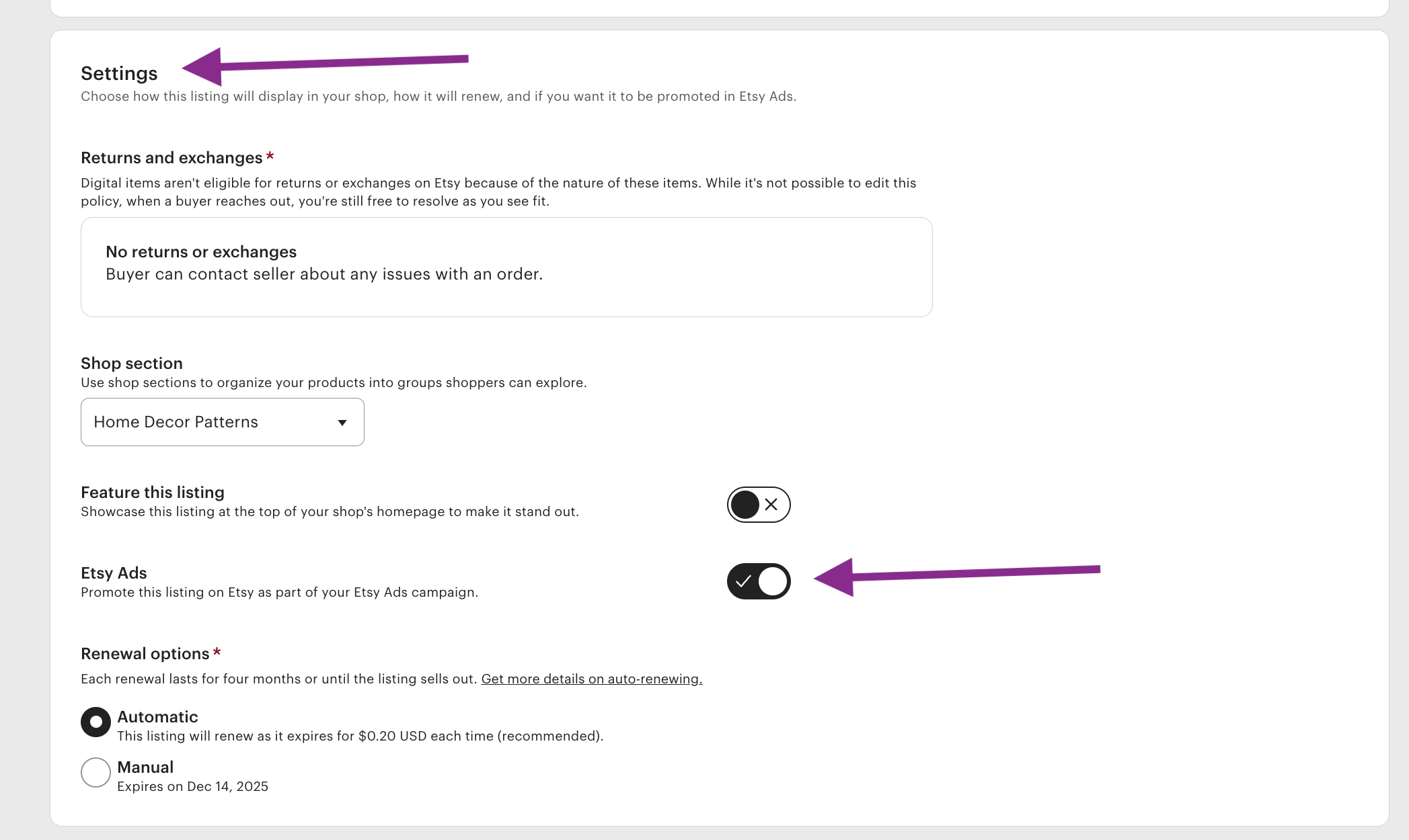 This does not impact the ads setting for existing listings. This only impacts NEW patterns created on Etsy through GoSadi.